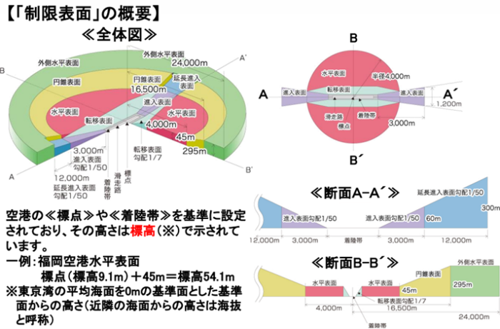 航空機の安全な航行を確保するため、空港の周辺には制限表面という空域が設定されており、この高さを超えて物件等を留置することは禁止されています。