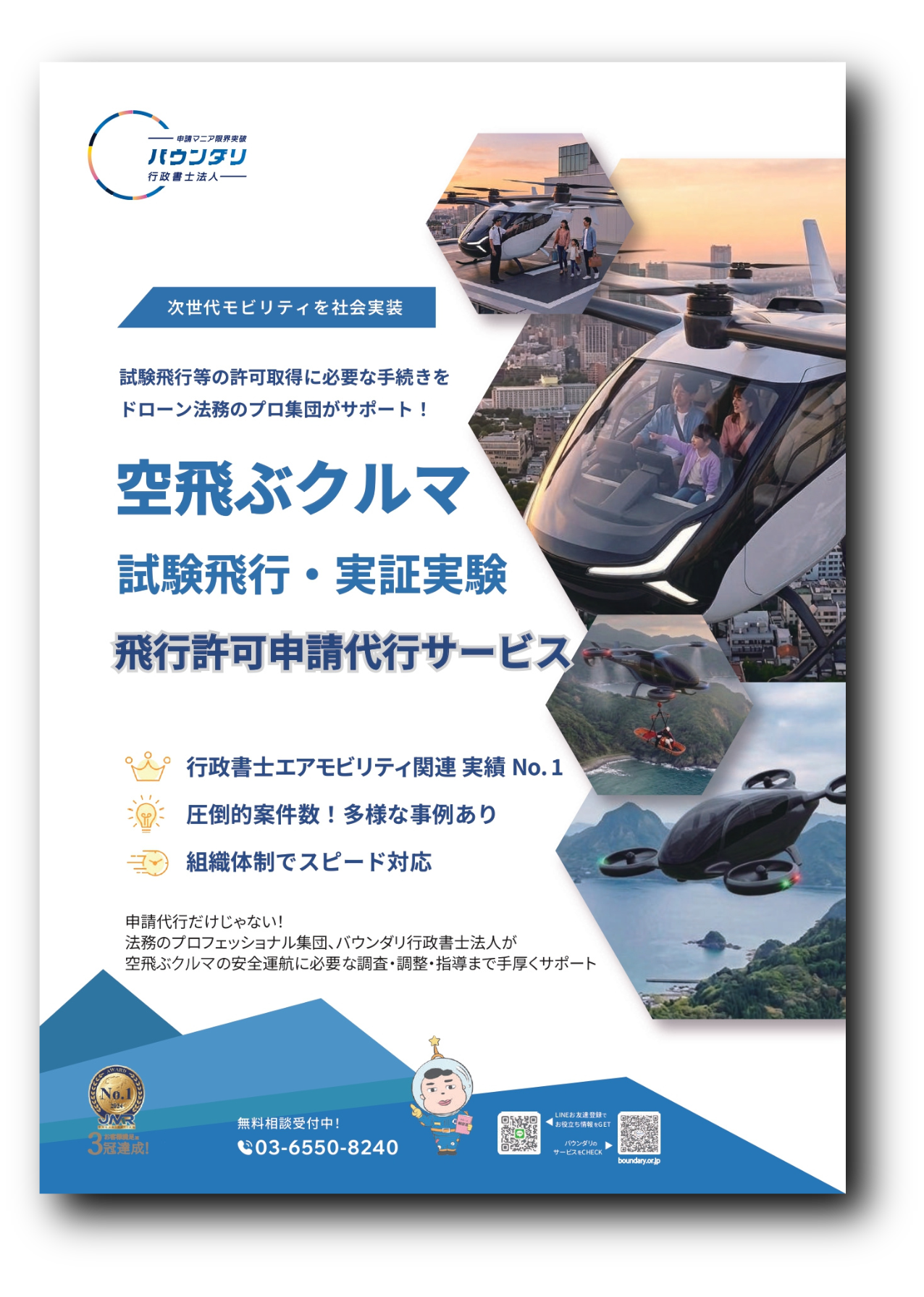バウンダリ行政書士法人は、無人航空機の許認可申請で培った豊富な実績を活かし、空飛ぶクルマに関する総合的な支援を提供し、多数の試験飛行の許可実績があります。