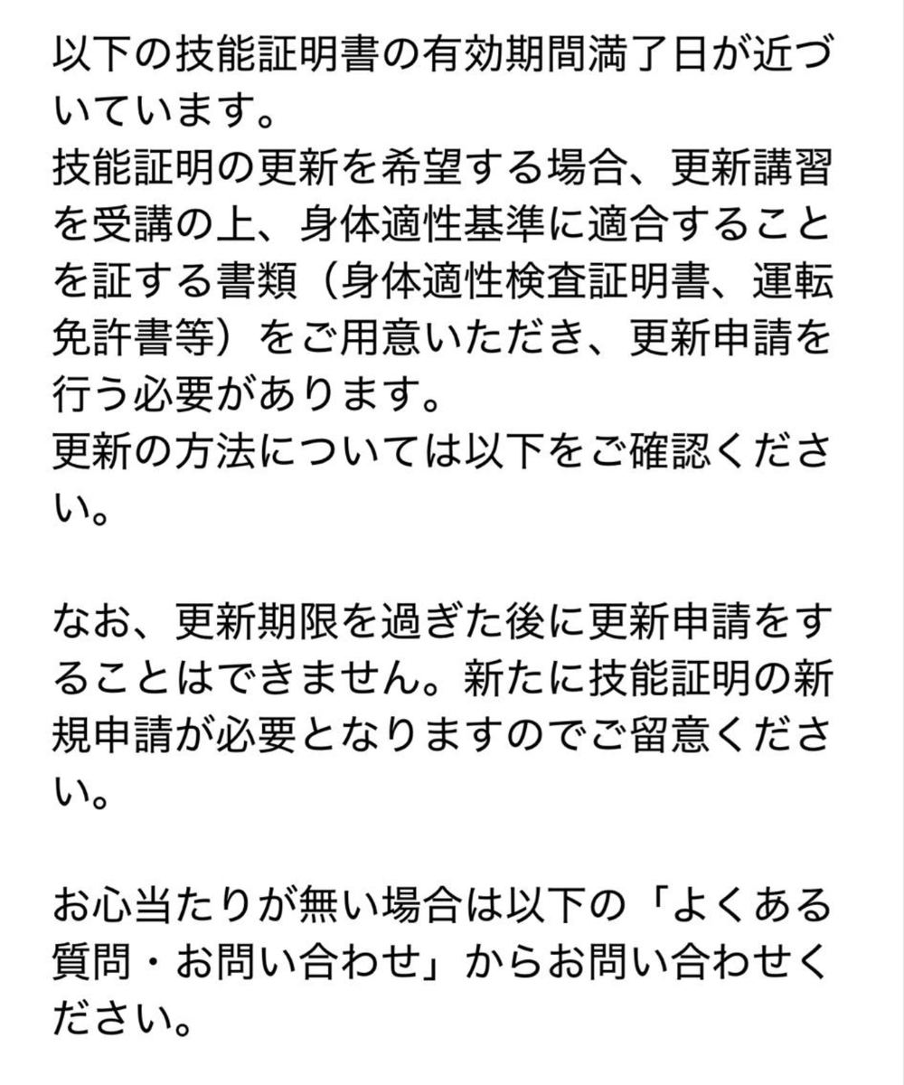 上記の「更新講習」か「失効再交付講習」のどちらの講習を受講する必要があるかについては、更新が近づく時期に国家資格取得者あてにDIPSのシステムから届く【技能証明更新時期リマインドメール】で確認することができます。