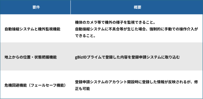 安全な飛行を実現するためには、機体の自動操縦システムと監視機能や操縦者のモニターによる遠隔操作技量、そして補助者配置や立入管理などの安全体制といった各要件を満たすことが不可欠です。
