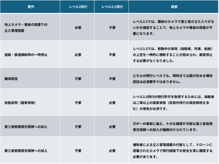 従来のレベル3飛行で必要だった立入管理措置や道路横断時の一時停止が、レベル3.5飛行では機体カメラを活用することで大幅に緩和されました。
