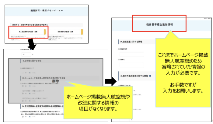 今回の審査要領改正により、飛行許可及び承認申請で資料の一部を省略することを可能としていた「ホームページ掲載無人航空機」の運用が廃止されます。型式認証機や機体認証機の場合はこれまでと同様に一部省略が可能です。