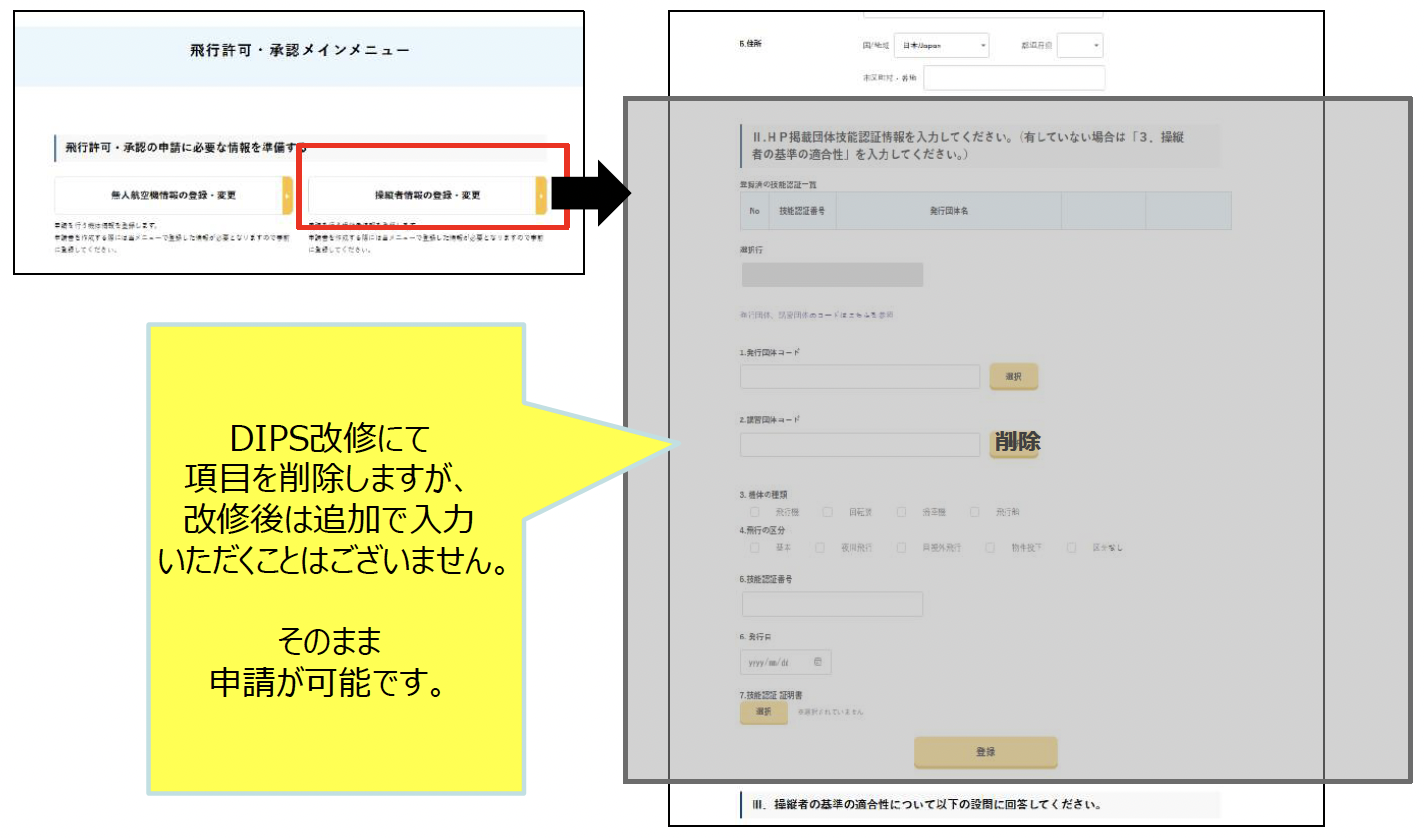 DIPS2.0システムでは、申請時に「操縦者情報の登録・変更」画面で操縦者情報から民間技能認証の項目が削除されます。