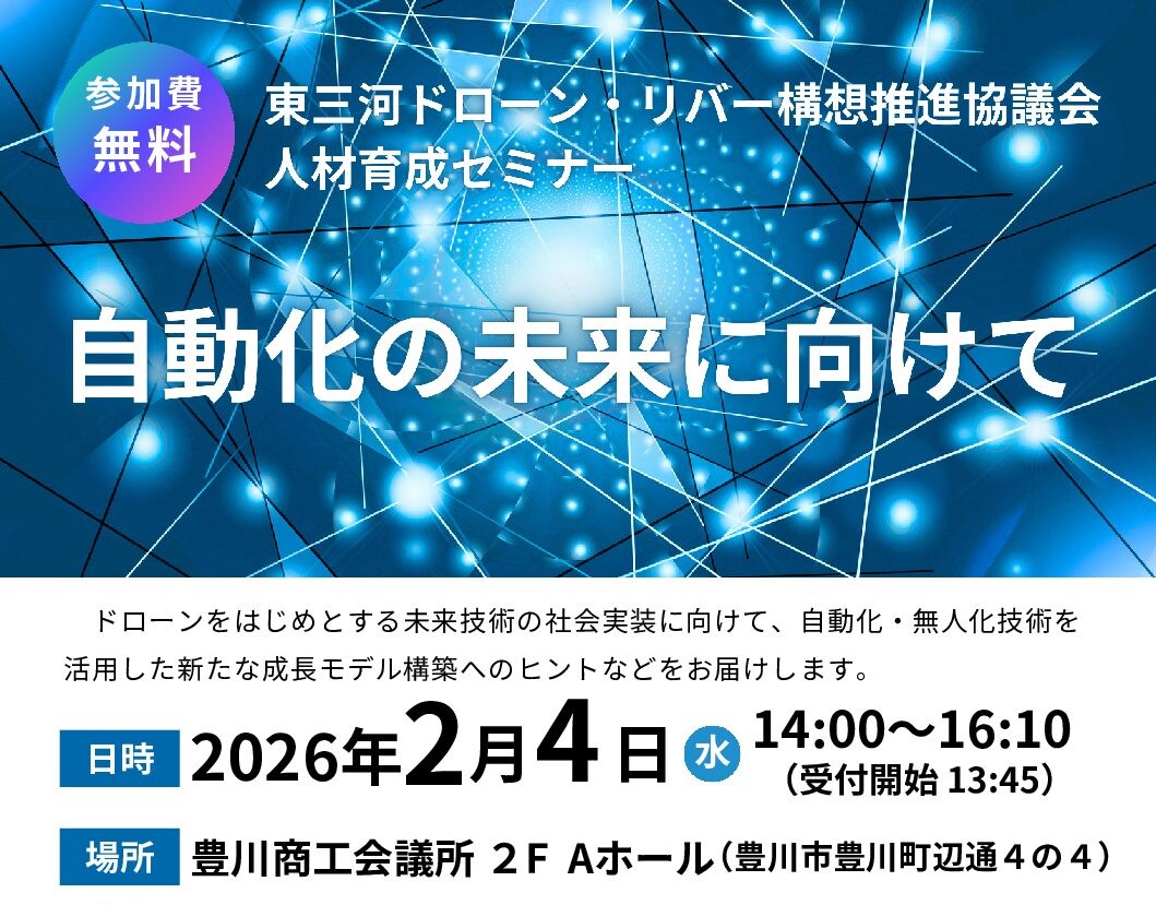 バウンダリ行政書士法人の代表・佐々木慎太郎は、東三河ドローンリバー構想推進協議会が主催する人材育成セミナー「自動化の未来に向けて」に登壇いたします。