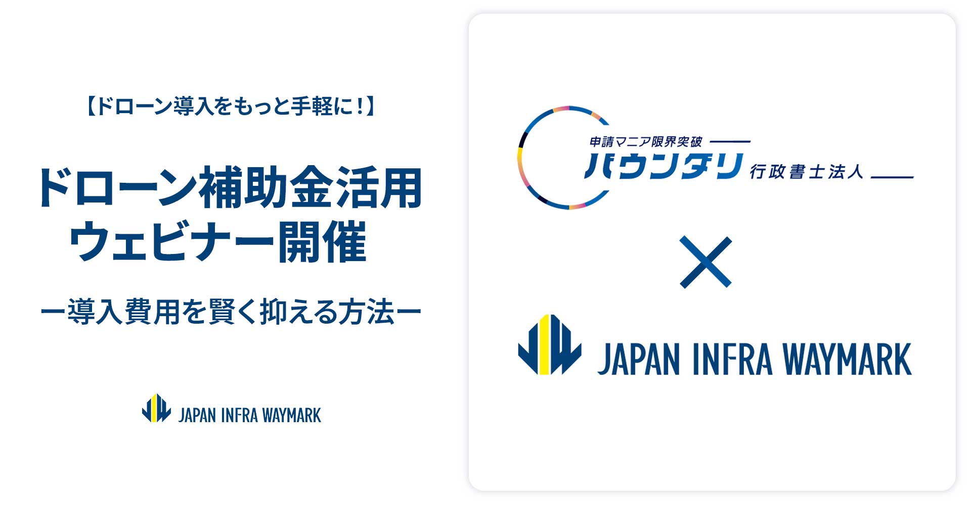 バウンダリ行政書士法人は、かねてよりサポートしているジャパン・インフラ・ウェイマーク社と共同で、2025年11月5日(水)、Zoomを使用したオンラインセミナー「ドローン補助金活用ウェビナー」を開催いたします。本ウェビナーでは、株式会社ジャパン・インフラ・ウェイマーク 事業推進部 インフラDX推進担当 担当課長 岡田正義氏ならびに弊社代表・佐々木慎太郎が登壇し、ドローン購入補助金の活用方法について実際の事例も交えて詳しく解説いたします。