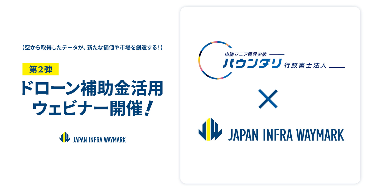 バウンダリ行政書士法人は、かねてよりサポートしているジャパン・インフラ・ウェイマーク社と共同で、2026年1月9日(金)、Zoomを使用したオンラインセミナー「ドローン補助金活用ウェビナー〈第2弾〉」を開催いたします。